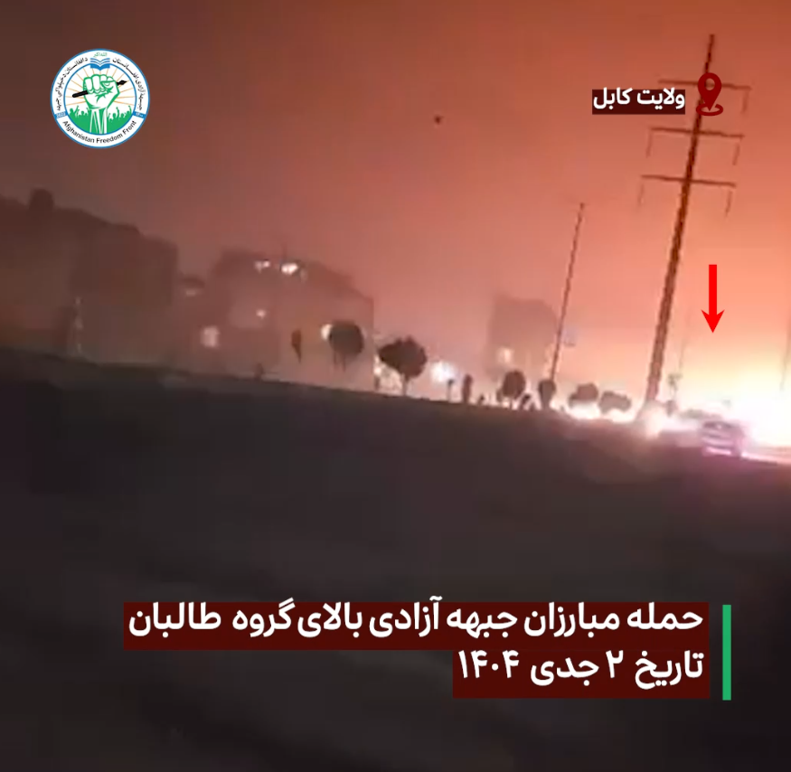 د افغانستان د آزادۍ جبهې مبارزینو د سهشنبې په شپه، د ۱۴۰۴ لمریز کال د جدی په ۲مه، شاوخوا د ماښام په ۸ بجو، د کابل ښار د څلورمې امنیتي حوزې اړوند د تهیهٔ مسکن په سیمه کې، د آریانا د تېلو ټانک ته څېرمه، د طالبانو د استخباراتي ملیشو یو نظامي رنجر موټر په نښه کړ.
