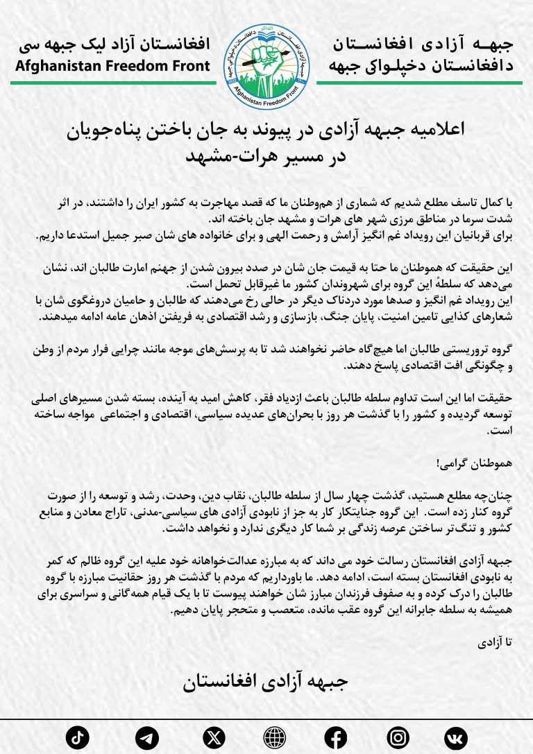 اخبار اعلامیه جبهه آزادی در پیوند به جان باختن پناهجویان در مسیر هرات-مشهد با کمال تاسف مطلع شدیم که شماری از هم… ادمین وبسایت۳۰ آذر ۱۴۰۴