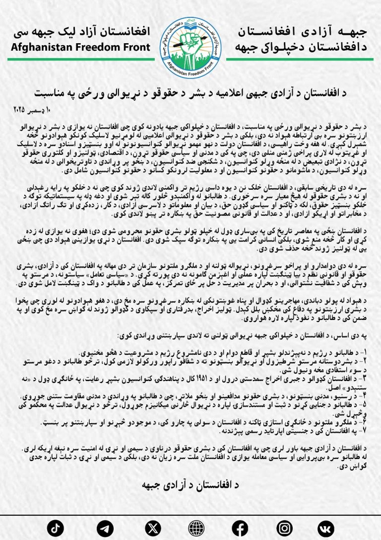 اخبار د افغانستان د آزادی جبهې اعلامیه د بشر د حقوقو د نړیوالې ورځې په مناسبت د افغانستان د آزادی جبهې اعلامیه د بشر … ادمین وبسایت۲۰ آذر ۱۴۰۴