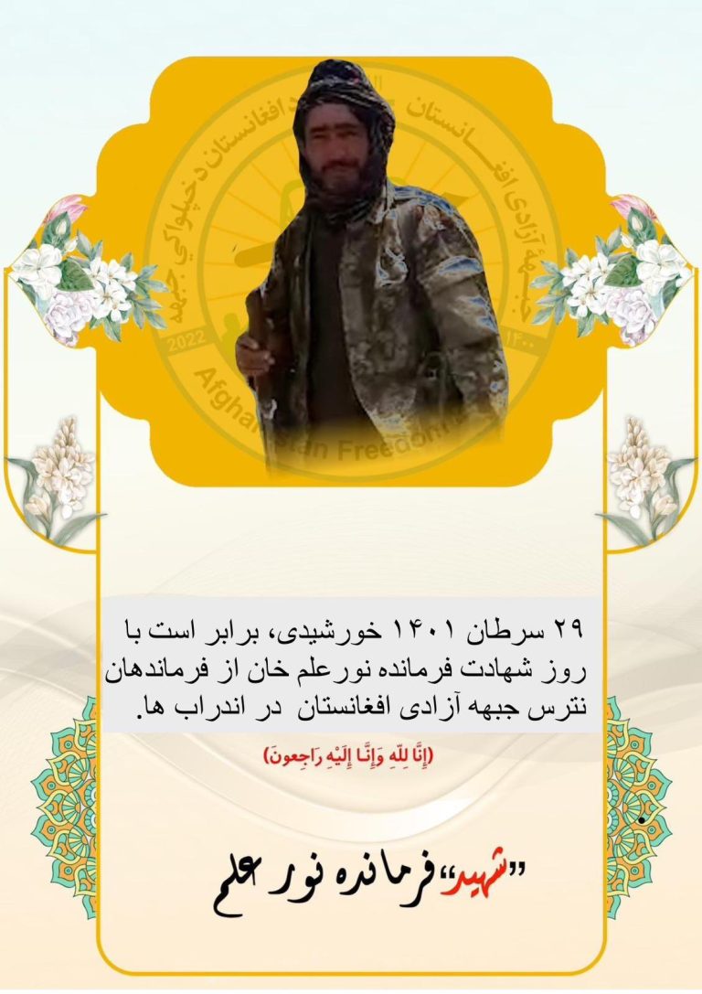 اعلامیهها ۲۹ سرطان امسال دومین سالروز شهادت فرمانده نورعلم خان از فرماندهان پرصلابت جبهه آزادی افغانستان در اندراب ها است. فرمانده نورعلم خان از نخستین سنگرداران… نویسنده۳۰ تیر ۱۴۰۳