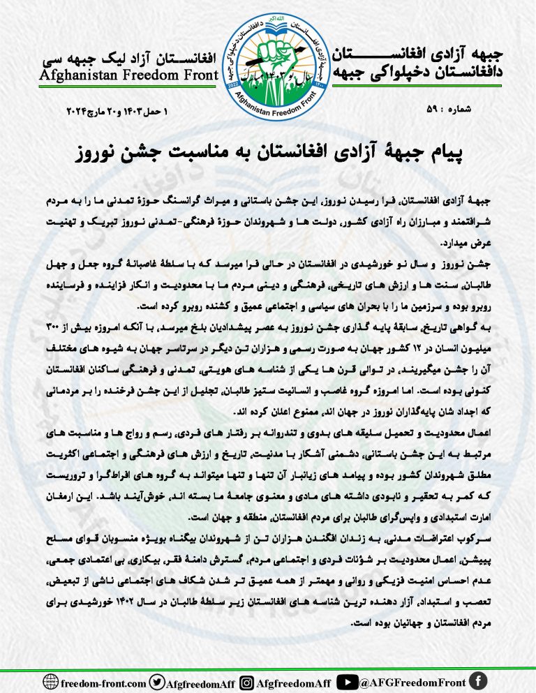 اعلامیهها پیام جبهۀ آزادی افغانستان به مناسبت جشن نوروز 1403 خورشیدی جبهۀ آزادی افغانستان، فرا رسیدن نوروز، … نویسنده۱ فروردین ۱۴۰۳